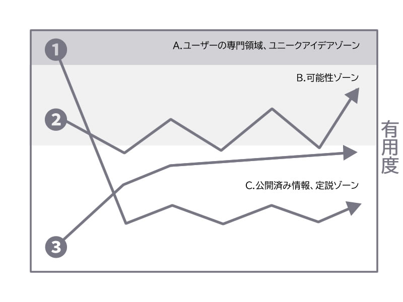 AIとのチャットは、❶のように、特許になるくらいユニークな情報には向かないが、❷のような実用新案的なアイデアに関するセッションは、有用かもしれない。熟練のキャッチャーのアドバイスを受けているうちに、次第に豪速球が投げられるようになるというような、知のキャッチボール体験ができることもある。ちなみに、こちらの問いの後に、システムから”よりよい答えのために考え中”というような表示が出たり、返答が有用だったかどうかをたずねてきた場合は、図中❷の創造的で有用なセッションだったと、個人的には思うことにしている。